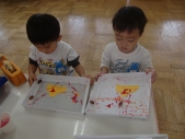 その後は、どんぐりに絵の具を付けて画用紙の上をコロコロ…